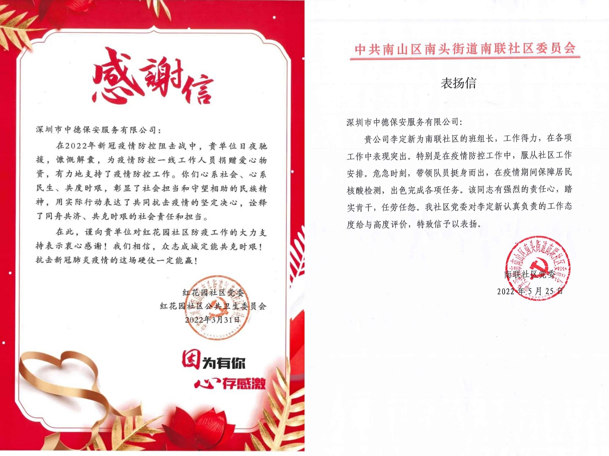 公司成立以来,始终坚持以服务社会为己任,以市场需求为导向,以依法经营为根本,吸收借鉴国内外先进的保安管理理念与模式,牢固树立“跟党走、讲忠诚、守德法、重科技、敢担当”的经营理念;秉持“以人为本、服务社会”的指导思想;信守“和谐生活、安全护航”的公司使命,践行“规范、效率、品质”服务方针,在习近平新时代中国特色社会主义思想指导下,砥砺前行,勇于创新,不断完善,先后获得ISO9001质量管理体系认证证书、ISO14001环境管理体系认证证书、OHSAS18001职业健康安全管理体系认证证书,2018、2019、2020年连续三年被评为重合同守信用认证企业。2018、2019、2020、2021年连续四年荣获“年度先进保安组织”称号,“南山区抗击肺炎疫情优秀党组织”,被深圳市退役军人事务局、共青团深圳市委员会评为深圳市支持红星志愿服务优秀单位,2021年被评为第二届金善奖“金善团队”称号、2022年被评为“抗疫先锋集体”、“工人先锋号”等荣誉称号。疫情期间,公司荣获全省保安行业抗击新冠肺炎疫情表现突出集体、抗疫先进单位、新冠肺炎疫情防控工作先进保安单位,深圳市商业联合会抗疫优秀保安公司。