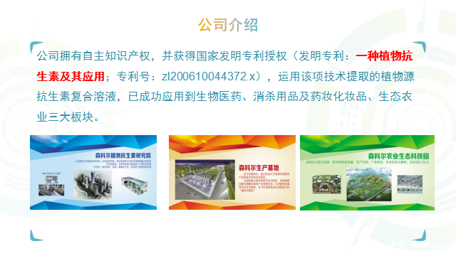 山东森科尔生物药业有限公司是山东省济南市高新区济南药谷的一家生物医药高科技创新型企业。公司主要开发植物抗生素系列产品。公司拥有自主知识产权,并获得国家发明专利授,公司利用专利技术平台开发研制医药、农业、卫生用品等系列产品。山东森科尔生物药业有限公司现阶段通过专利技术提取源发性植物抗生素符合溶液,并开发研制:生物医药、消杀用品及药妆化妆品类、生态农业三大板块系列产品。