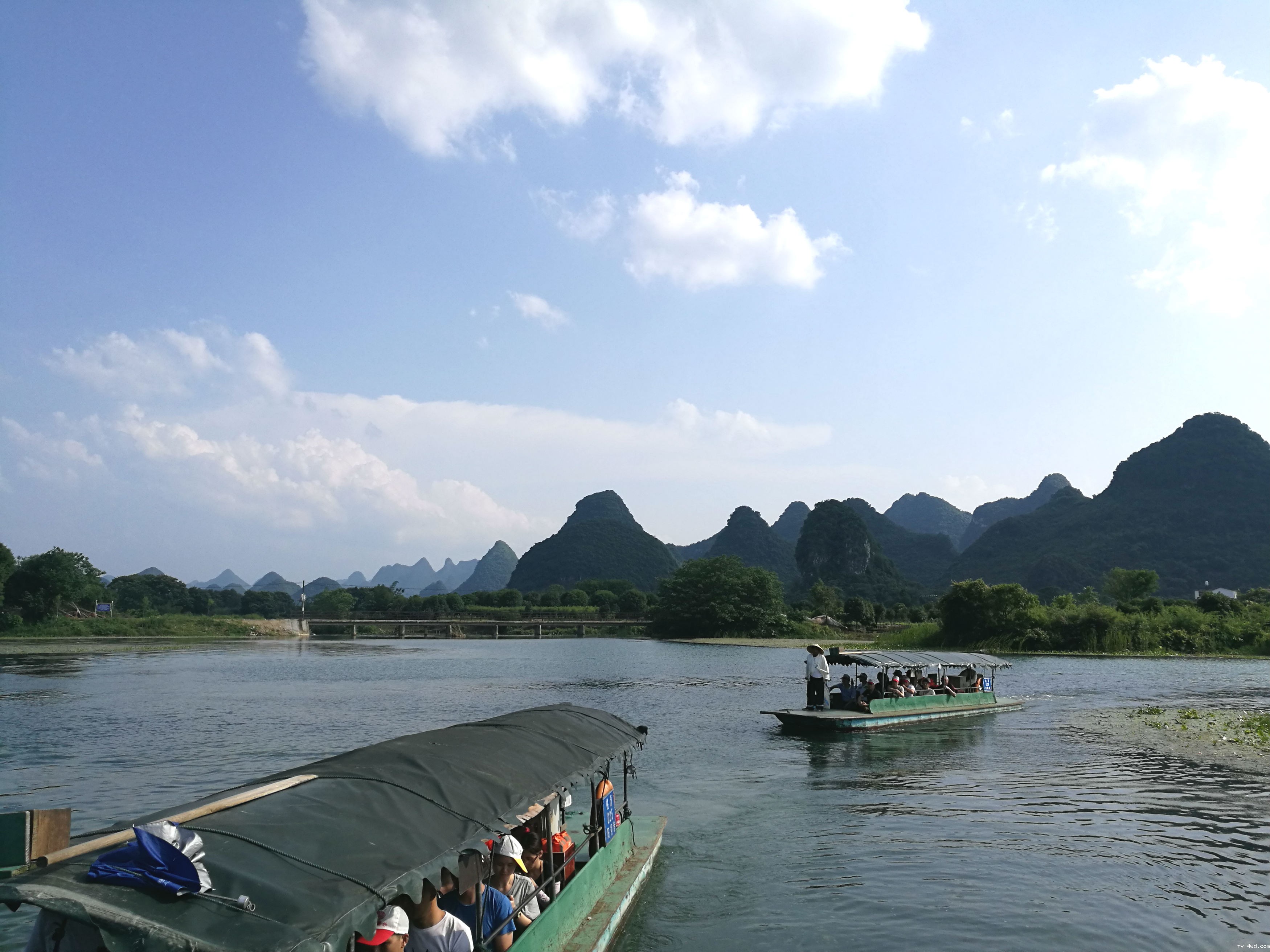 刚进入阳朔境内,车窗外的群山便呈现出桂林青山独有的秀美之姿。很快,高铁便抵达阳朔站,出了高铁站,一抬头,一座拔地而起的山峰就映入眼帘,果然,桂林最不缺的就是“石头”。我们一行人在导游的带领下乘大巴前往兴坪古镇。古镇并不大,是一条长约一公里的石板街,游人不是很多,青石板路上泛着时光的痕迹,路的两旁还保留着最原始的砖瓦结构的房屋,透露出浓浓的怀旧气息。没有刻意地修复,一派天然,还有老人悠闲地坐在门边抽着旱烟,偶尔传来的那是无法仿造的悠然古韵。