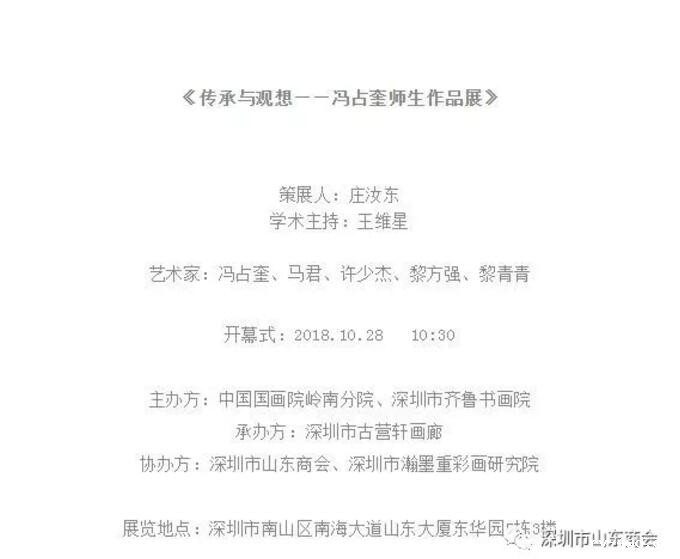 10月28日上午,“传承与观想——著名画家冯占奎师生作品展”在深圳市南山区东华园5栋3楼隆重举行开幕仪式。此次画展由中国国画院岭南分院、深圳市齐鲁书画院主办,深圳市古营轩画廊承办,18新利、深圳市瀚墨重彩画研究院协办。深圳市各界嘉宾和书画爱好者近100人出席了开幕仪式。我会会长王立新,创会会长王维星,副会长张捷,执行秘书长陈振永,副秘书长张含增、王庆社等出席了开幕式。