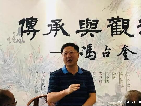 原深圳市南山区政协主席陈章联,中国国画院岭南分院院长、深圳市齐鲁书画院院长、我会创会会长王维星,会长王立新,深圳市翰墨重彩画研究院院长赵巨耀,学生代表马君小姐先后讲话,共祝展览成功。王维星院长在讲话中回忆了与冯占奎先生的交往,对冯占奎先生的花鸟画作品给予高度赞赏。