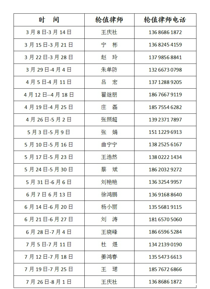 为了及时地为商会会员提供法律咨询服务,加强商会法工委律师与商会会员之间的沟通,制定本《法律咨询轮值表》,由指定时间段的律师为打入商会办公室、秘书处的咨询电话者提供法律咨询服务,由商会办公室、秘书处接到咨询电话的工作人员转给当日对应的轮值律师,每位律师轮值时间以一周为单位。