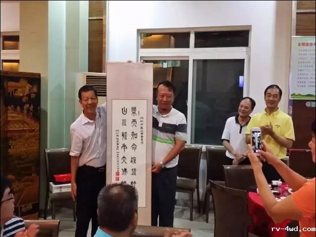 下午3时,各位秘书长前往古龙峡景区,先参加万丈崖栈道瀑布探险,再参加古龙峡猛龙漂流。 晚歺时的互动交流,秘书长们围桌而坐,互相做自我介绍、交换名片。承办单位深圳市乐山商会秘书长黄承发表了热情洋溢的欢迎辞。主办方代表、山东商会副会长伍柳江代表深圳市异地商会秘书长联席会议对乐山商会的无私奉献及大家的辛勤付出表示衷心的感谢,希望各异地商会秘书长加强合作交流,共同将异地商会秘书长联席会议这个平台建设好。为表达感激之情,年届七十的深圳市福建商会执行秘书长陈加明现场向乐山商会赠送了自己亲自书写的书法。