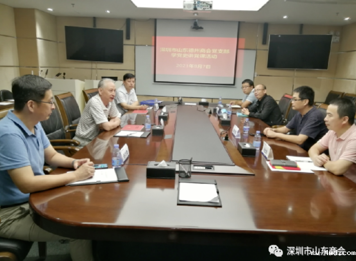 2021年8月7日上午,深圳市山东德州商会党支部在德州商会会长单位爱维艾夫医院集团会议室召开“学习党史讲党课”专题组织生活会。会议由德州商会党支部书记王德强同志主持,支部5名党员、1名入党申请人参会。