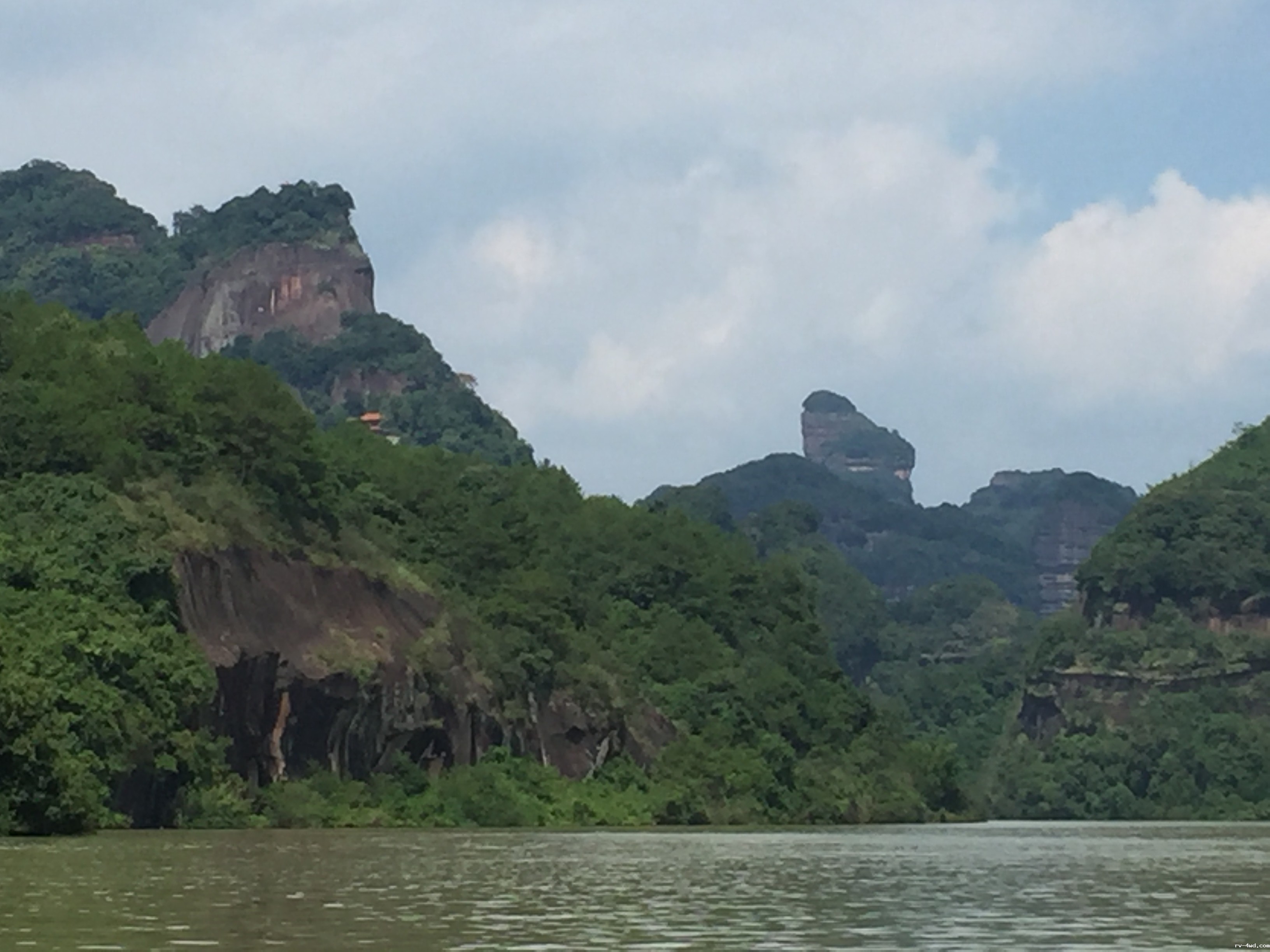 进了丹霞山景区,我们径直来到水上丹霞的入口。水上丹霞游的是锦江上游,锦江是条安静的河流,河水墨绿,两边青山苍翠。上了船,细细体味徜徉青山绿水间的惬意。舟行碧波上,一片红色石崖铺呈在眼前,这就是丹霞山的标志——赤壁丹崖,置身其中,不免“横看成岭侧成峰”。在旁边的绝壁丹崖上清晰可以看到“南无阿弥陀佛”六个大字,这些从石壁中长出的石屋就是千年古庵——锦石岩寺。