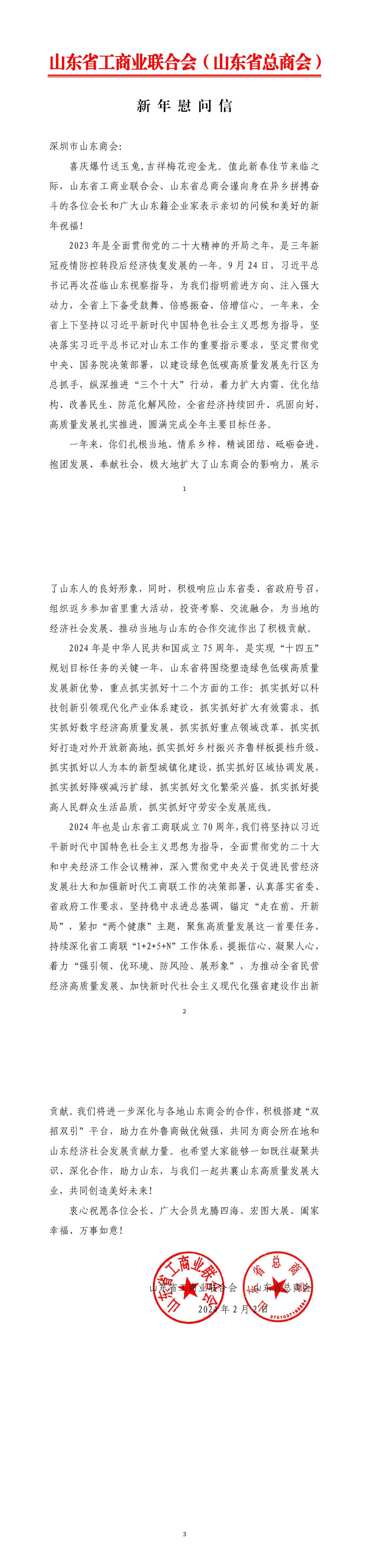 【商会动态】山东省工商业联合会(总商会)向我会发来新春慰问信