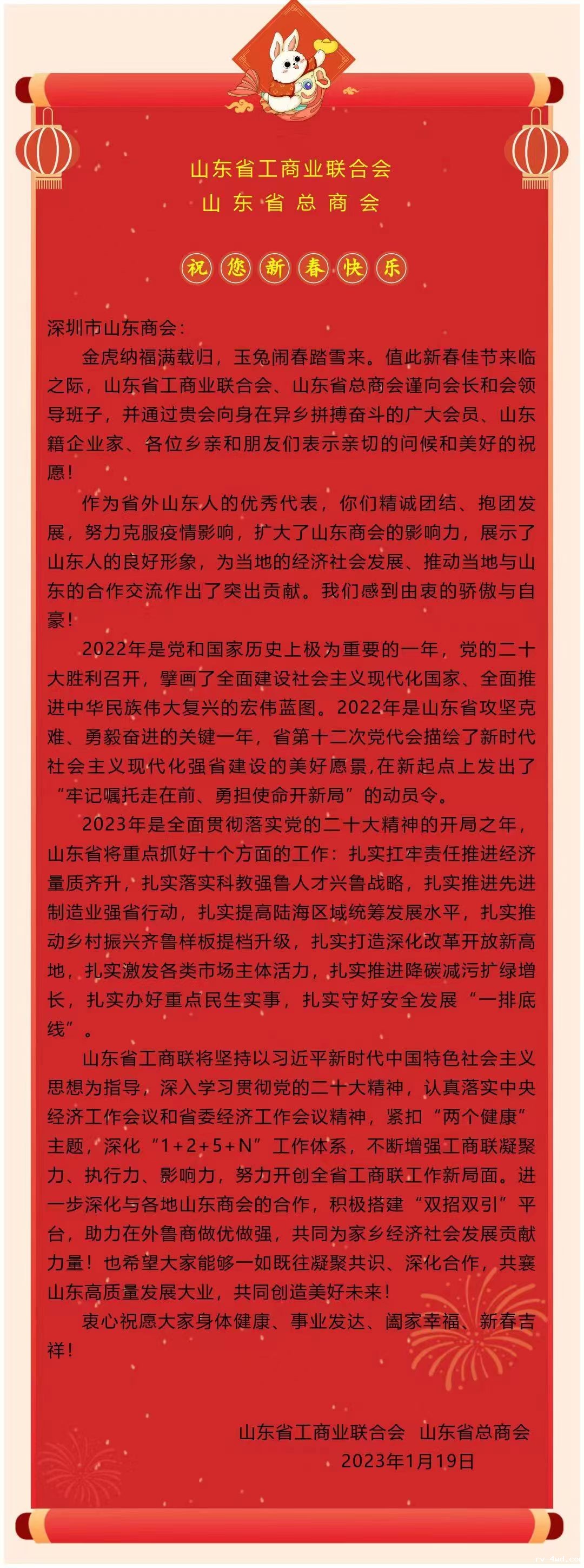 玉兔迎春百花艳,神州纳福万象新。值此2023年新春佳节来临之际,我会收到山东省工商业联合会的新春问候,向我会及广大会员致以节日的问候和美好的新春祝愿!