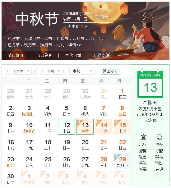 中秋节,又称月夕、秋节、仲秋节、八月节、八月会、追月节、玩月节、拜月节、女儿节或团圆节,是流行于中国众多民族与汉字文化圈诸国的传统文化节日,时在农历八月十五;因其恰值三秋之半,故名,也有些地方将中秋节定在八月十六。中秋节始于唐朝初年,盛行于宋朝,至明清时,已成为与春节齐名的中国主要节日之一。受中华文化的影响,中秋节也是东亚和东南亚一些国家尤其是当地的华人华侨的传统节日。自2008年起中秋节被列为国家法定节假日。2006年 5月20日,国务院列入首批国家级非物质文化遗产名录。