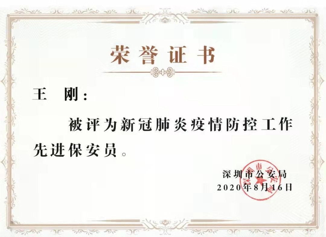 2020年初疫情突袭到如今的疫情防控常态化管理,王刚同志本能的军人觉悟和敏感性在短时间内安排部署好各分护点工作安排。他立即带领党员成立先锋突击队,带领公司300名保安员奔赴一线,在城中村、车站、商场、隔离酒店卡口为市民体温测试,为返深人员进行登记排查疫情并及时上报社区。同时,还兼任街道、社区疫情防控护卫项目总负责人,统筹公司内部资源及协调政府支持,积极落实新型冠状病毒防控工作方案,亲自赴城中村、住宅小区、商业楼宇、酒店隔离区等疫情联合防控检测点现场指挥督导,加强部署,确保防控到位,不留死角。疫情反复,防控任务繁重,王刚放下公司的业务,带头驻点社区,维护秩序、协调指导群众扫码登记,并安排队员为街道社区基层工作者提供清凉物资。
