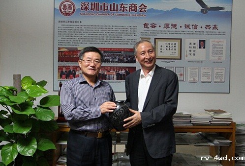 王维星会长和伍柳江秘书长分别向客人介绍了商会自成立以来的发展情况和下一步的工作计划,刘西良副市长对商会的发展给予了高度赞赏,并就双方之间的合作进行了深度交谈。之后,刘西良副市长给商会赠送了日照黑陶“团圆罐”。
