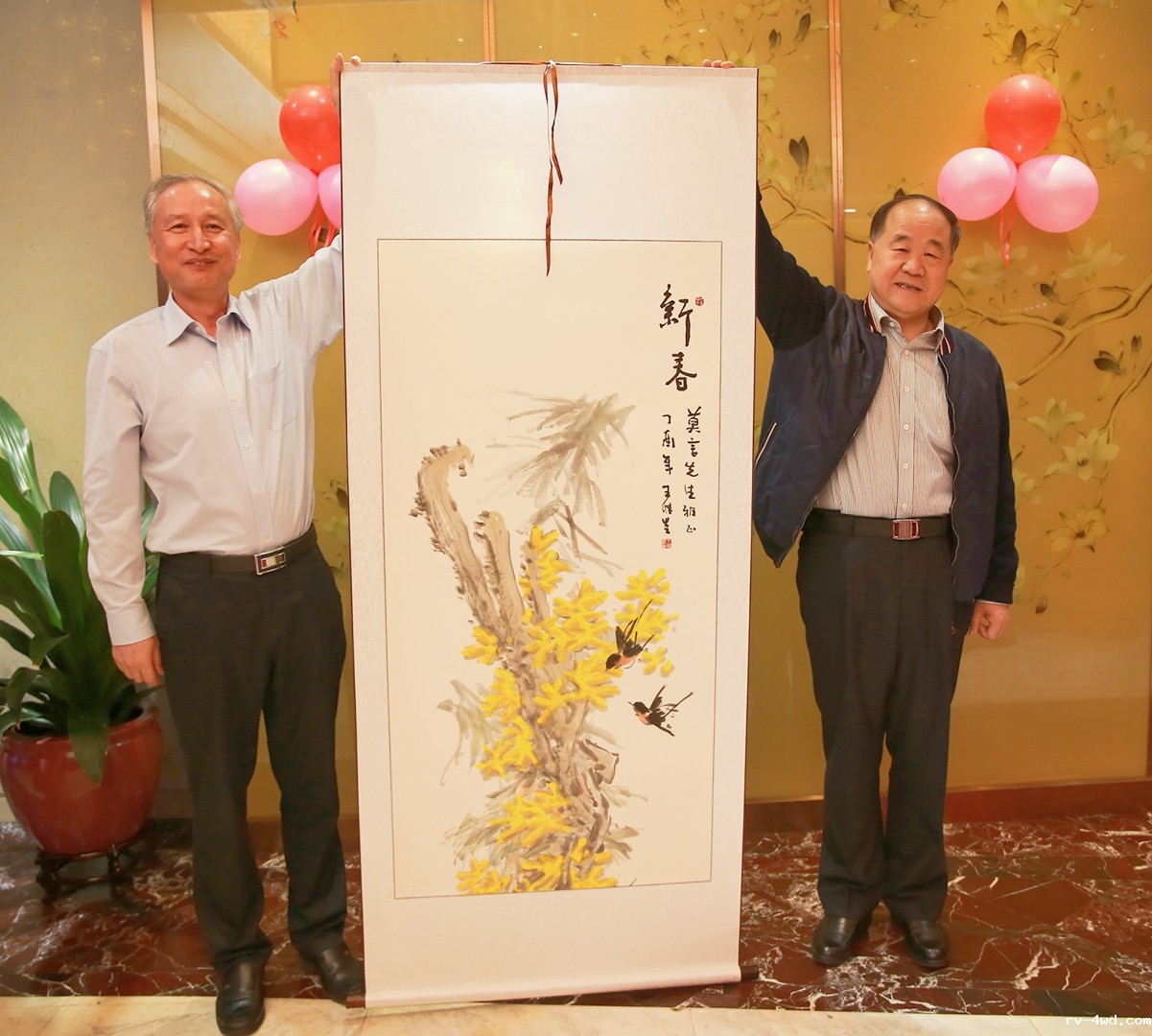 之后,商会创会会长王维星先生给莫言先生赠送了他的国画作品《新春》,表达了对莫言先生的美好祝福。莫言先生回赠给商会五套他亲笔签名的系列丛书,表达了对18新利的支持与祝愿。
