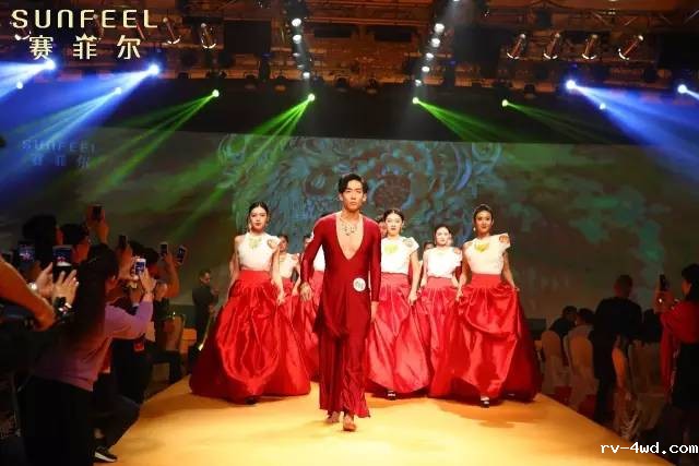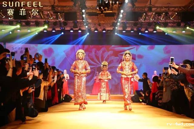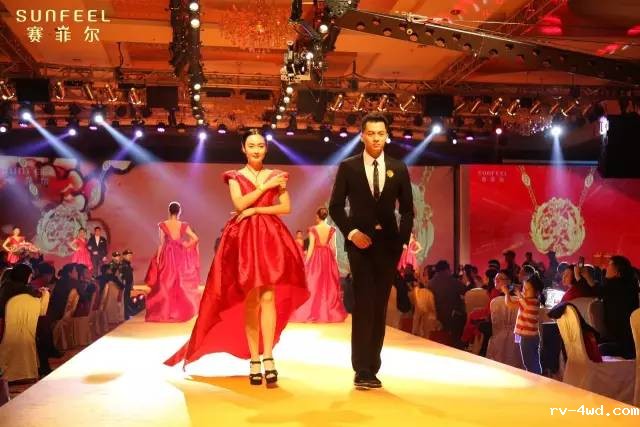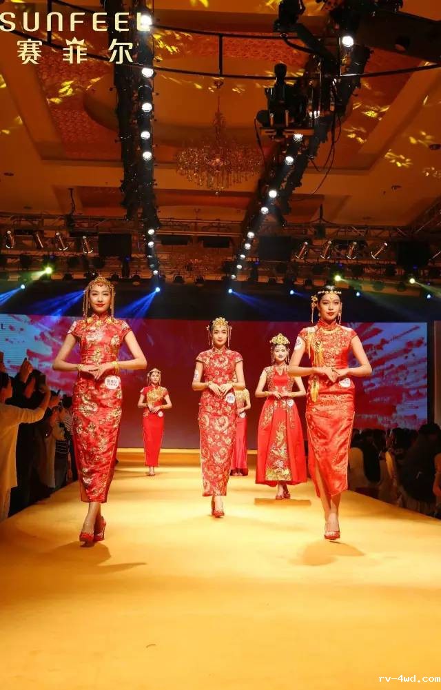 除此之外,伴随着跃动的音符,身着赛菲尔大美中国风万足金婚纱的9位模特缓缓步入舞台。就像悦动的音乐一样,覆盖整场的红色,点缀其中的赛菲尔无焊料黄金就似音乐中不时闪动的华丽音色,在灯光下,让人如梦似幻,感受着以传统文化为基石结合现代设计,融古纳新,打造出的美轮美奂的赛菲尔大美中国风万足金婚纱所带来的视觉盛宴。